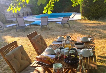 Das reichhaltige Frühstück genießen Sie im Sommer draußen am Pool im Schatten der Kastanienbäume oder auf der Veranda. Zum Frühstück gibt es frisches Brot (oder leckeres hausgemachtes glutenfreies Brot), Kuchen oder französische Brioche oder Gebäck des Tages, hausgemachten Joghurt (normal oder vegan), hausgemachtes Müsli, Obst, Orangensaft, Kaffee oder Tee, Eier, Käse (oder veganer Käse), hausgemachte Marmelade. Sie können auch ein glutenfreies, milchfreies, eifreies oder veganes Frühstück bestellen, lassen Sie es uns einfach wissen, wenn Sie Ihr Zimmer buchen.