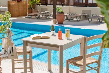 Natürlich ist GOJIs veganes Restaurant/Snackbar am Pool das Herzstück unserer Einrichtung. Unsere Gäste können ihr Frühstück mit handgemachten Marmeladen, einer Auswahl an Brot, frisch gebrühtem Kaffee oder Tee aus lokalen Kräutern mit Mandel-, Hafer- oder Sojamilch und frisch geschnittenem Obst genießen. Zum Mittagessen können die Gäste jeden Tag ein lokales veganes Gericht probieren, z. B. “Gigantes” (Riesenbohnen) mit veganem Fetakäse und Tomatensauce oder unsere berühmten rhodischen “Pitaroudia” (Kichererbsenbällchen mit Kräutern). Die Gäste können auch aus unserer veganen Wein- oder Cocktailkarte wählen, z. B. den GOJI Mojito.