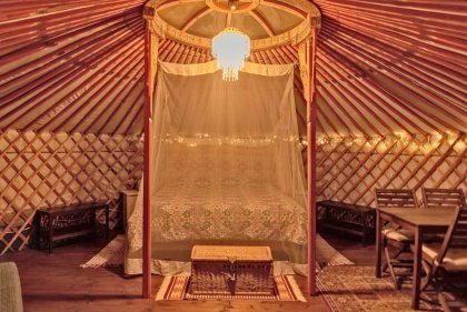 Wir haben jetzt ein südafrikanisches Safarizelt, zwei mongolische Jurten und ein Familienzelt, unser Lodge-Zelt. Alle Zelte verfügen über ein eigenes Bad mit Dusche mit fließend warmem und kaltem Wasser, eine normale Toilette und ein Waschbecken. Handtücher und umweltfreundliche Toilettenartikel werden gestellt.