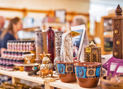 Hauseigenes Café Maya mit WLAN und angrenzendem Shop für den Yogi*ni-Alltag, Sonnenterrasse, Spaziergänge, Nordic Walking oder Wandern im angrenzenden Park Silvaticum und den idyllischen Wäldern der Umgebung.
