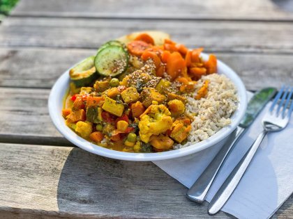 Frische Salate, Gurke, Möhre, Rote Beete und zwei verschiedene Dressing sind dabei Hauptbestandteile unseres Buffets. Wer lieber warm isst, für den sind zudem Dampfgemüseplatten aus Brokkoli, Möhren, Süßkartoffeln und Fenchel sowie Currys, Dal, Suppen eine super Alternative zur grünen Rohkostbar. Darüber hinaus gibt es auch immer eine Auswahl an guten Ölen, Körner und Kernen. Brot bzw. glutenfreie Alternativen sowie hausgemachte vegane Aufstriche gibt es zum Brunch.