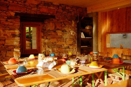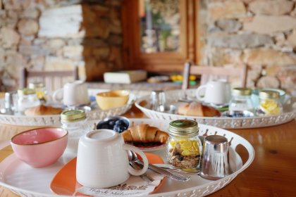 Im kleinen Saal mit Blick auf den Wald servieren wir ein reichhaltiges veganes Frühstück, süß und salzig: Brot und Pizza aus Sauerteig, im hauseigenen Holzofen gebacken, Kuchen und Kekse, frisch gepflücktes Obst, Säfte, Kräutertees und Marmeladen, die mit den Produkten aus unserem Gemüsegarten, aus dem Wald und aus der Gegend zubereitet sind. Tee und Kaffee kommen aus dem fair trade.