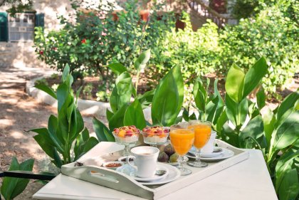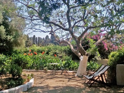 Unser Bio-Garten bietet eine reiche Vielfalt: Olivenbäume, Johannisbrotbaum, Trauben, Feigen, Stachelbirne, Myrte, Granatäpfel, Zitronen, Orangen, Mandarinen, Pampelmusen, Guaven, Pflaumen, Aprikosen, Tomaten, Paprika, Auberginen, Gurken und anderes Gemüse und Kräuter. Unter den mächtigen Bäumen ist auch ein Platz für Yogaübungen eingerichtet.