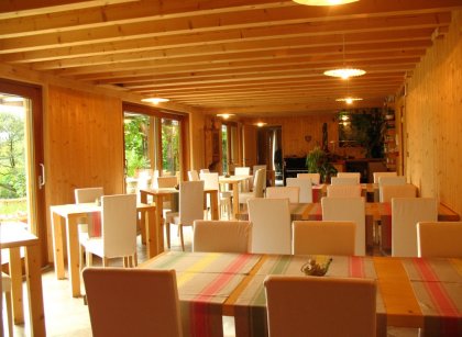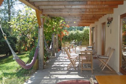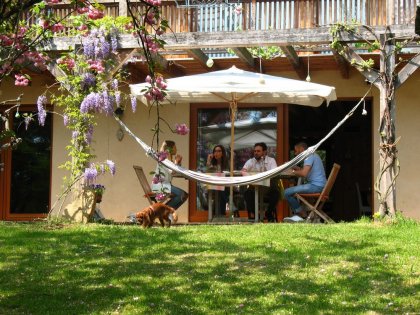 Die Liebe zum Detail, durch Farben, Töne und Düfte, sowie die großzügige auf den Garten blickende Fensterfront, bilden eine entspannende Atmosphäre. An sonnigen Tagen kann das Essen auch auf der breiten Veranda genossen werden, wo man sich anschließend in den Hängematten ausspannen kann.