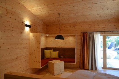 Auch wenn das Angebot des Hauses um eine Halbpension erweitert wird, ist es gezielt reduziert: Beim Frühstück gibt es nicht 25 Teesorten, sondern fünf in hochwertiger Qualität. Genauso ist es bei Käse, dem Wein oder den selbstgemachten Marmeladen. Maracuja-Marmelade oder exotische Superfruits sucht man im „aufatmen“ dagegen vergeblich. Was man aber an jeder Ecke des Hauses findet, ist das Zusammenspiel von Tradition und Moderne. Diese zeigt sich in der Architektur ebenso wie in der Wiedererweckung alter Tiroler Bräuche und auch in der Küche.